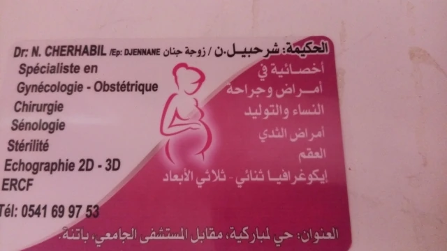 Le cabinet de Gynécologie obstétrique du docteur N CHERHABIL DJENNANE, localisé à BATNA, dans la wilaya de BATNA vous accueille de 08:00h à 16:30h, vous trouverez ci-dessous tous les actes pratiqués et les pathologies traitées par cet établissement.
