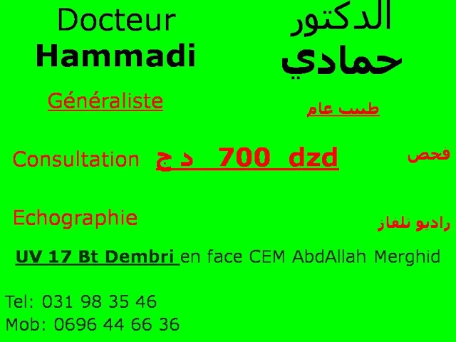 Le cabinet de médecine générale du docteur ABDELHAMID HAMADI, localisé à EL KHROUB, dans la wilaya de CONSTANTINE vous accueille de 09:00h à 17:00h, vous trouverez ci-dessous tous les actes pratiqués et les pathologies traitées par cet établissement.